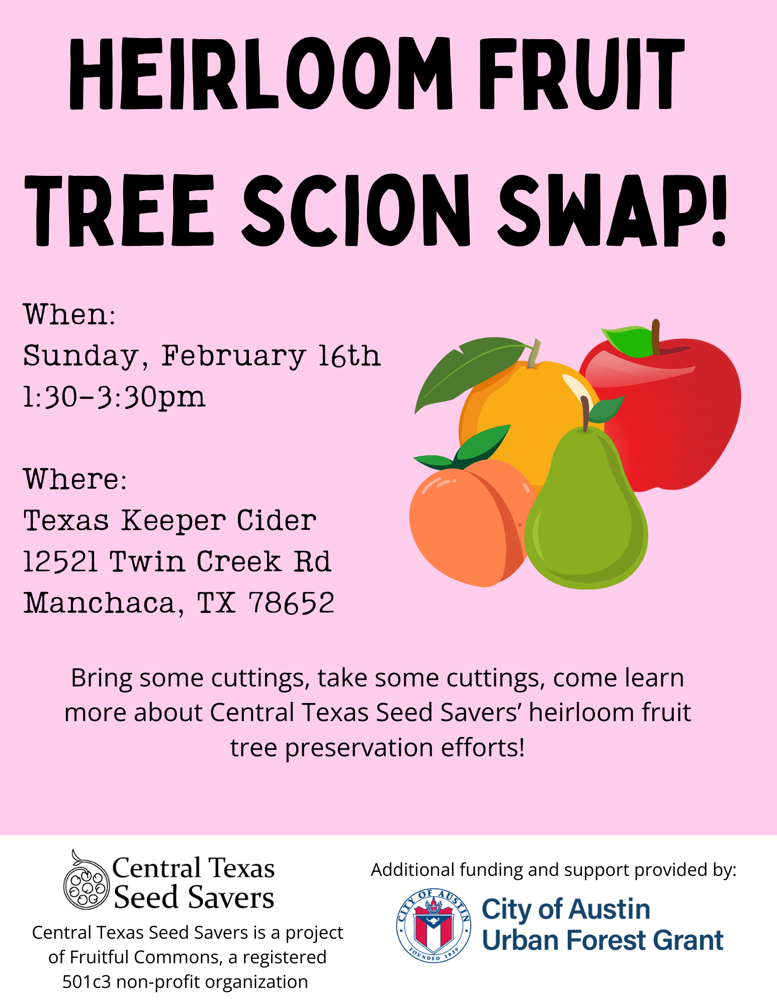 Supported by an Urban Forest Grant through the City of Austin, the Central Texas Heirloom Fruit Tree Preservation Project seeks to identify, propagate, and share these special trees with the public. Community engagement is a crucial part of the project’s mission, and we hold regular classes, grafting workshops, scion swaps, and other meetups to raise awareness and empower the public to participate in our preservation efforts.